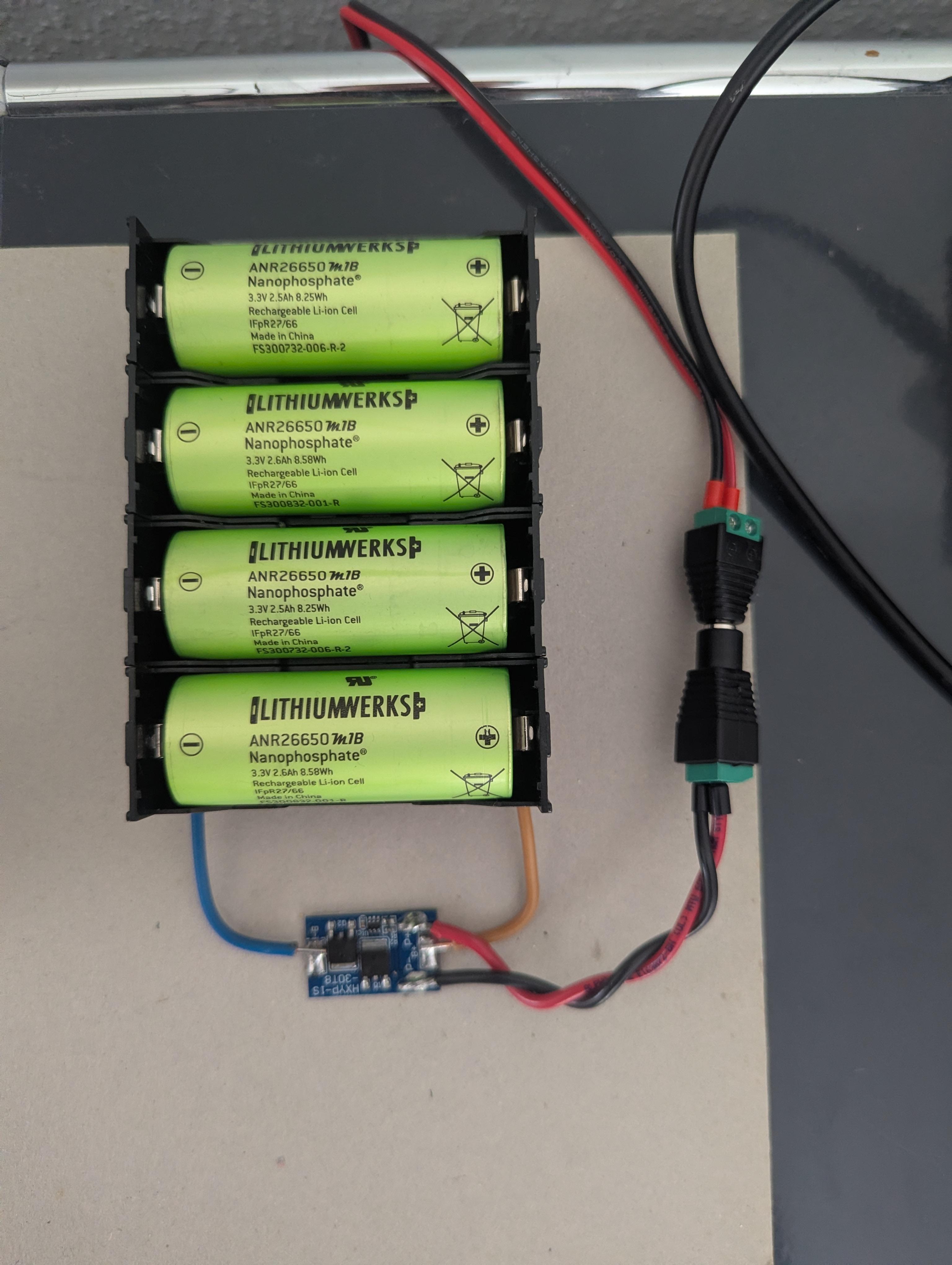 Vier parallele LiFePo4 Zellen, die eine kleines BMS für Überladungs- und Tiefenentladungsschutz haben. Geladen mit einem LiFePo4 Ladenetzteil: https://de.aliexpress.com/item/1005005820188525.html